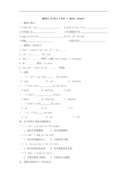 Module10Unit2Don’tshout,please!一、翻译小能手。1.climbthetree2.swimintheriver3.在草地上走4.在动物园大叫5.jumponthebed6.felloffthebed7.做操8.骑自行车二、据提示,补全句子。1.Don’tswiminthesea.It’sd________.2.Let’sc________thetree.3.Don’t________(呼叫,大喊).Yourfatherissleeping.4.My________(婴儿)iscute.5.Youcan’twalkonthe________(草地).三、选择。()1....