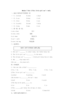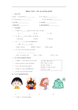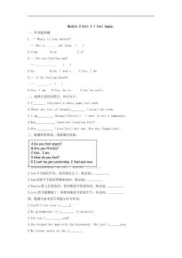 Module9Unit2Ifeelhappy.一、单项选择题1.—Whereisyourmother? —Sheis______thefarm.( )A.from B.on C.of2.—Areyoufeelingsad?—____________. ( )A.No. B.No,Idon't. C.Yes,ldo.3.—Ishefeelingbored? —_________.( )A.Yes,Iam. B.Yes,heis. C.No,hecan't.二、选择合适的词填空,补全句子。1.I(win/won)achessgamelastweek.2.Therearelotsofanimals(...