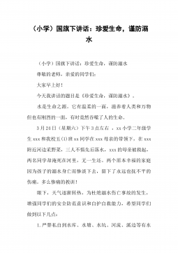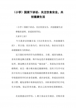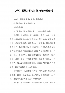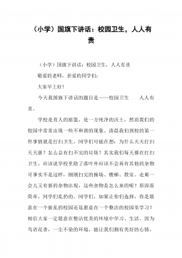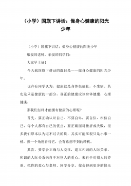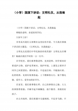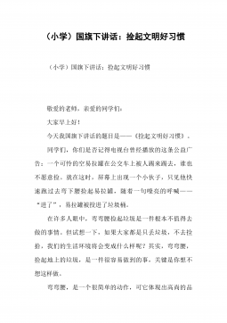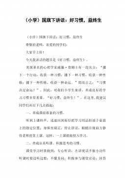 (小学)国旗下讲话:好习惯,益终生 (小学)国旗下讲话:好习惯,益终生 尊敬的老师,亲爱的同学们: 大家早上好! 今天我讲话的题目是《好习惯,益终生》。 美国著名的心理学家威廉·詹姆士有一段名言:“播下一个行动,收获一种习惯;播下一种习惯,收获一种性格;播下一种性格,收获一种命运。”简而言之:“习惯决定命运!”。因此,对我们小学生来讲,养成良好的学习习惯非常重要。“好习惯,益终生!”。在这里,我建议同学们从以下几点做起: 一、养成课前准备的习惯。 听到上课铃声,迅速回到座位把学习用品轻放于桌面上的指定位置;身体坐端正,停止讲话,眼睛注视前方静待老师进堂上课。这样,一上课就能投...