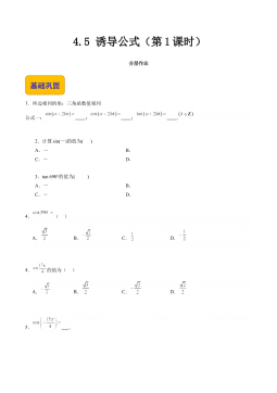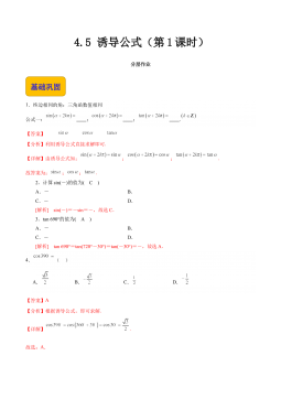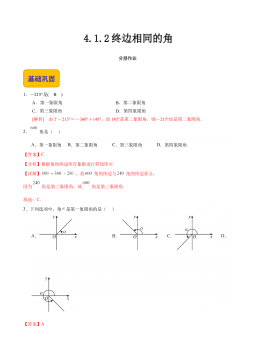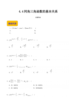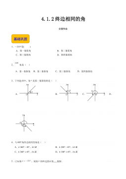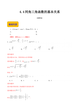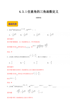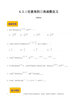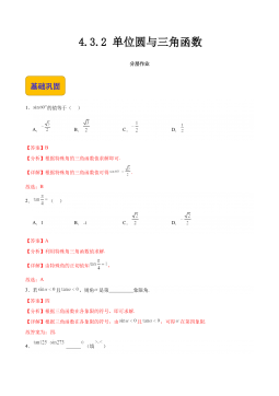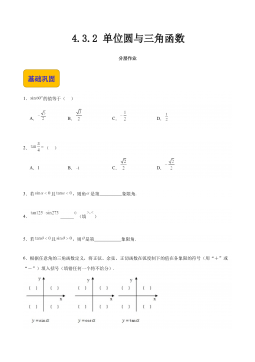 4.3.2单位圆与三角函数分层作业1.的值等于( )A.B.C.D.【答案】B【分析】根据特殊角的三角函数值求解即可.【详解】根据特殊角的三角函数值可得.故选:B2.( )A.1B.C.D.【答案】A【分析】利用特殊角三角函数值求解.【详解】由特殊角的正切值知,故选:A3.若且,则角是第象限角.【答案】四【分析】根据三角函数在各象限的符号,即可求解.【详解】根据三角函数在各象限的符号,由且,可得在第四象限.故答案为:四.4.(填)基础巩固【答案】【分析】直接判定角所在象限及其正负即可.【详解】在第二象限,,在第四象限,,,故答案为:.5.若且,则是第象限角.【答案】二【分析】根据各...