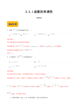 3.3.1函数的单调性分层作业1.函数的单调递减区间是( )A.B.C.D.【答案】A【分析】根据反比例函数的性质得解;【详解】解:因为定义域为,函数在和上单调递减,故函数的单调递减区间为和;故选:A2.下列函数中,在上为增函数的是( )A.B.C.D.【答案】D【分析】对四个选项逐一分析函数的单调性,由此得出正确选项.【详解】对于A选项,函数在上递减.对于B选项,函数在和上递减.对于C选项,函数在上递减,在上递增.对于D选项,函数在上递减,在上递增,故也在上递增,符合题意.故选D.3.如图为函数y=f(x),x∈[-4,7]的图象,指出它的单调区间.基础巩固[解析] 函数的单调增...