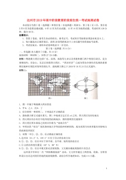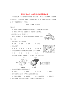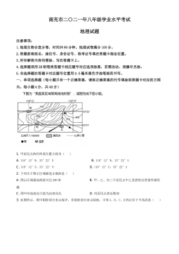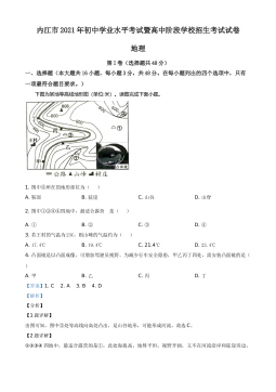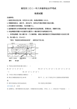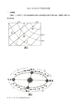 2021年达州中考地理试题一、选择题中国的“二十四节气”已列入联合国教科文组织人类非物质文化遗产代表作名录。根据图1和图2,完成下面小题。1.图1中,甲乙丙丁四地描述错误的是()A.丁点的经纬度位置是(20°S,160°E)B.甲在丁的东南方C.若图1中虚线为晨昏线,当虚线处迎来日出时,图中四地处于夜晚的只有乙地D.甲地位于中纬度、西半球、南温带2.结合图1、图2中的信息,判断下列说法正确的是()A.当地球公转到图2中的①段位置时,此时甲处昼短夜长B.达州的同学参加2021年中考时,地球公转到图2中的②段位置C.地球公转到图2中的③段位置时,欧洲地中海沿岸河流多数时间处于汛期D.当地球公转到图...