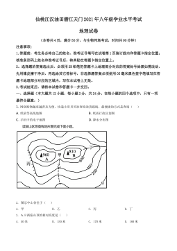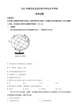 2021年湖北省宜昌市初中学业水平考试地理试题注意事项:本试卷分试题卷和答题卡两部分,请将答案写在答题卡上每题对应的答题区域内,写在试题卷上无效,考试结束,请将本试题卷和答题卡一井上交。一、选择题地球仪是地球的模型,是学习地理的重要工具之一。读图回答下列小题1.有关地球仪上经纬线的说法,正确的是( )A.每一条经线的形状是一个圆B.不同纬度数的纬线长度不同C.在地球仪上,0°经线是赤道D.纬线指示南北方向2.图中甲乙丙丁四地中,既位于北半球又位于西半球的是( )A.甲B.乙C.丙D.丁3.图中四地中,既无极昼、极夜现象,又无阳光直射的是( )A.甲和乙B.丙和丁C.甲和丙D.乙和丁...
