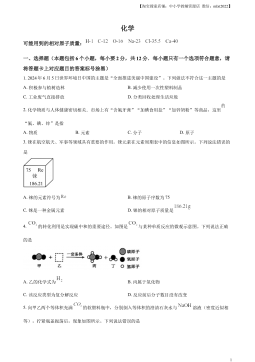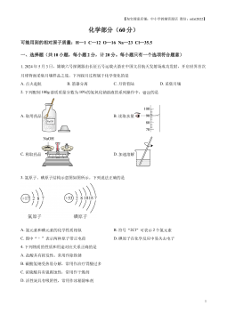 【淘宝搜索店铺:中小学教辅资源店微信:mlxt2022】二○二四年齐齐哈尔市初中学业考试化学试卷考生注意:1.考试时间90分钟2.全卷共五道大题,总分100分3.使用答题卡的考生,请将答案填写在答题卡的指定位置可能用到的相对原子质量:H-1C-12N-14O-16Na-23Mg-24S-32C1-35.5K-39Ca-40Fe-56Cu-64Zn-65Ag-108一、选择题(本题共15小题,每小题2分,共30分。1~12小题每题有一个选项符合题意,13~15小题每题有一个或两个选项符合题意)1.下列元素符号表示氟元素的是A.HeB.FC.PD.N2.下列各图所示实验操作正确的是A.点燃酒精灯B...
