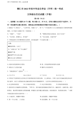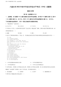 【中小学教辅资源店微信:mlxt2022】六盘水市2022年初中毕业生学业水平考试(中考)试题卷综合文科第I卷(选择题共63分)一、选择题:本大题第1-14小题为道德与法治学科选择题,其中第1-9小题每小题2分,第10—14小题每小题3分,共33分。第15—29小题为历史学科选择题,每小题2分,共30分。下列各题的备选答案中,只有一项是正确或符合题意的答案。1.“国际禁毒日”是每年的()A.5月17日B.6月26日C.7月9日D.12月1日,2.19世纪七十年代,左宗棠率领军队采用“先北后南,缓进急战”策略,打败中亚浩罕国将领阿古柏,成功收复的地区是()A.新疆B.香港C.澳门D.台湾3.你学...