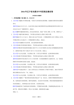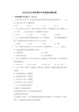 2016年辽宁省本溪市中考思想品德试卷一、单项选择题(每小题1分,共25分)1.(1分)2015年9月3日,纪念中国人民抗日战争暨世界反法西斯战争胜利( )周年大会在北京天安门广场隆重举行。A.60B.65C.70D.752.(1分)2015年11月16日,国家主席习近平在出席二十国集团领导人第十次峰会上宣布,中国( )将主办2016年二十国集团领导人峰会( )A.乌镇B.大连C.杭州D.福州3.(1分)国际货币基金组织执董会2015年11月30日批准( )加入特别提款权货币篮子,新的货币篮子将于2016年10月1日正式生效。( )A.人民币B.美元C.欧元D.英镑4.(1分)美国科...