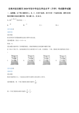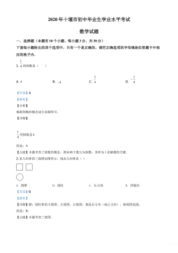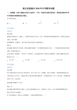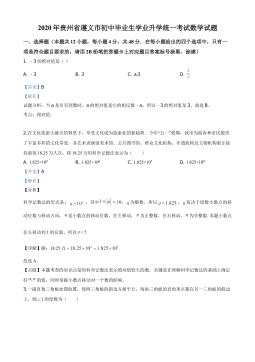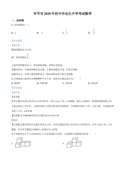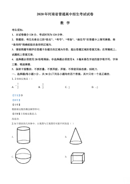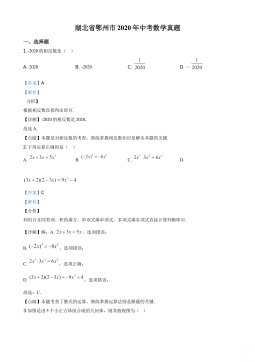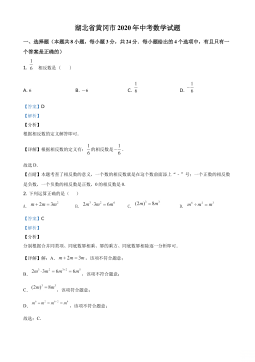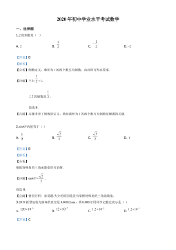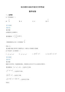 哈尔滨市2020年初中升学考试数学试卷一、选择题1.的倒数是()A.B.-8C.8D.【答案】A【解析】【分析】由倒数的定义求解即可.【详解】解:∵,∴根据倒数的定义知:﹣8的倒数是.故选:A.【点睛】本题主要考查了倒数的定义,乘积为1的两数互为倒数.2.下列运算一定正确的是()A.B.C.D.【答案】C【解析】【分析】根据合并同类项、同底数幂的乘法、幂的乘方以及完全平方公式逐项计算即可.【详解】解:∵,∴选项A不正确;∵,∴选项B不正确;∵,∴选项C正确;∵,∴选项D不正确;故选C.【点睛】本题考查了整式的运算,熟练掌握运算法则及完全平方公式是解答本题的关键.同底数的幂相乘,底数不变,指数相...