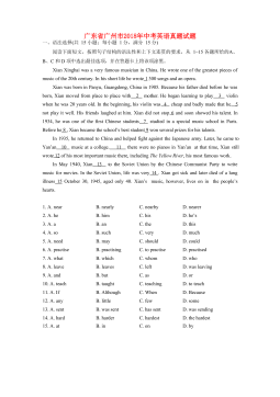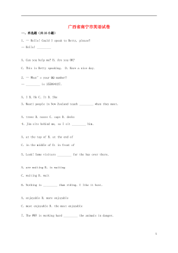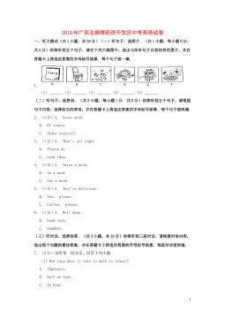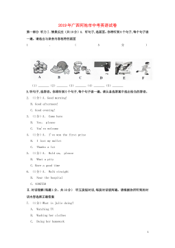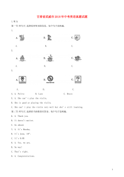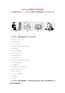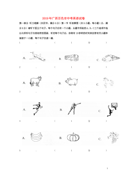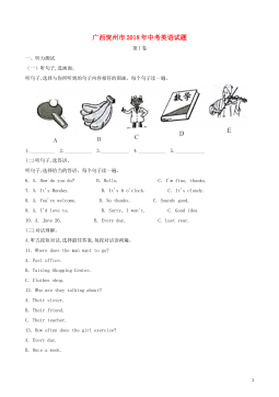 广西贺州市2018年中考英语试题第I卷一、听力测试(一)听句子,选画面。听句子,选择与你所听到的句子内容相符的图画。每个句子读一遍。1.__________2.___________3.___________4.___________5.____________(二)听句子,选答语。听句子,选择恰当的答语。每个句子读一遍。6.A.Howdoyoudo?B.Hello.C.I'mfine,thanks.7.A.It'sMonday.B.It's6o'clock.C.It'scloudy.8.A.You'rewelcome.B.Nothanks.C.Soundsgood.9.A.I'dloveto...
