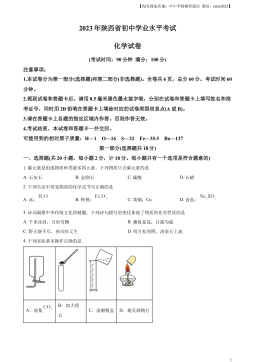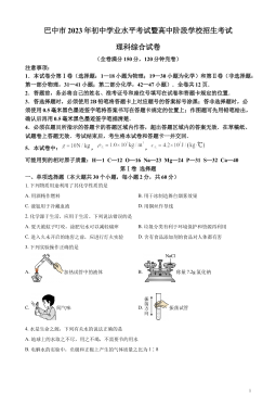 巴中市2023年初中学业水平考试暨高中阶段学校招生考试理科综合试卷(全卷满分150分,120分钟完卷)注意事项:1.本试卷分第Ⅰ卷(选择题:1—18小题为物理;19—30小题为化学)和第Ⅱ卷(非选择题:第一部分物理,31—41小题;第二部分化学,42—47小题).全卷共12页.2.答题前,务必将自己的姓名、准考证号和座位号填写在试卷和答题卡规定的位置.3.答选择题时,必须使用2B铅笔将答题卡上对应题号的答案标号涂黑;答非选择题时,必须使用0.5毫米黑色墨迹签字笔将答案书写在答题卡规定的位置上;作图题可先用铅笔绘出,确认后再用0.5毫米黑色墨迹签字笔描清楚.4.必须在题目所指示的答题卡的答题区域...
