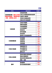 行政部绩效考核指标岗位绩效目标行政成本控制行政工作流程改善目标完成率内部员工满意率行政办公设备完好率行政工作计划完成率行政经理行政文书管理20%档案归档管理15%行政后勤管理20%公共设施维护15%环境卫生5%停车场管理15%安全投诉5%职责外工作完成及时性5%行政管理助理印章管理35%车辆保养30%车辆分配20%仓库管理15%行政文书助理档案管理工作25%会议管理工作30%公文管理工作30%接待工作15%外联公关助理各种证照的办理及维护45%事务办理保密性35%保证证照办理的合法性20%转款,验资0%翻译现场翻译60%技术及商务资料翻译30%权重(%)行政高级经理(建议公司领导提出其他的、增...