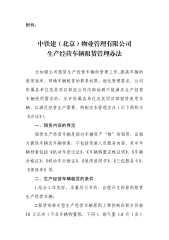 附件:中铁建(北京)物业管理有限公司生产经营车辆租赁管理办法为加强公司租赁生产经营车辆的管理工作,提高车辆的使用效率,明确车辆租赁的职责权限、细化管理要求。公司所属各单位及其项目部经公司内部协调不能满足生产经营车辆使用需求的,允许所属各单位及其项目部租赁使用车辆,以满足经营生产需要。特制定本管理办法(以下简称为《办法》)。一、租赁内容的界定租赁生产经营车辆是指对车辆资产“物”的租赁,出租方提供车辆及车辆档案,不包括驾驶人员服务内容。其中车辆档案包括《机动车登记证》、《车辆购置完税证明》、《车辆合格证》、《机动车行驶证》、《使用说明书》、《三包服务卡》、《保险单》等。二、生产经营车辆租赁的条件1...