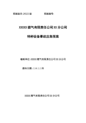 预案版本:2022版预案编号:XXXXX燃气有限责任公司XX分公司特种设备事故应急预案编制单位:XXXXX燃气有限责任公司XX分公司颁布日期:二0二二年XXXXX燃气有限责任公司XX分公司XXXXX燃气有限公司XX分公司特种设备事故应急预案1总则1.1编制目的为了及时,快速有效,妥善处置加气站意外发生的各种突发事故事件,充分发挥现场第一人应对突发事故事件的反应能力,加快信息传递速度,便于上级及有关部门快速组织救援行动,控制事态的发展。特制定本预案。1.2编制依据《特种设备安全法》《特种设备安全监察条例》《特种设备使用管理规则》《气瓶安全技术规程》《特种设备事故应急预案编制导则》1.3适用范围我...