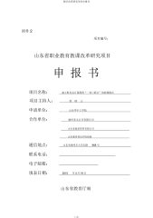 教学改革研究项目申报书附件2项目编号:山东省职业教育教课改革研究项目申报书项目名称:项目主持人:申请单位:合作单位:建立财务会计课程群“一体三联合”的教课模式徐联云山东华宇工学院德州亚太公司有限公司山东泰鼎新资料有限公司山东德州智讯手机商场通信地点:联系电话:电子邮箱:填表日期:山东省德州市大学东路968号2015年4月19日山东省教育厅制1/20填表说明1.填写此表时,不要随意改变栏目和规格;内容简洁扼要。如因篇幅原由需对表格进行调整,应当以“整页设计”为原则。2.《申报书》一式三份。项目同意后,省教育厅、学校项目管理部门及项目组各存1份。3.本表所附《申报书(活页)》供匿名评审使用,一定填...