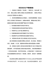 项目安全生产管理制度一、项目施工中要坚持“安全第一、预防为主、综合治理”的方针,落实山西省《建筑工程施工安全管理标准》,按照公司和业主安全生产管理办法认真执行。二、各项目部要重视安全文明施工,各项目部要明确一名安全责任人负责施工项目的安全,加强安全教育,增强安全施工意识,提高安全操作技能,各项目部要严格执行五不准制度。1、安全措施未做到齐全有效不准作业;2、不按规定使用安全劳动保护用品不准作业;3、非特种作业人员不准从事特种作业;4、机械电器设备安全防护配置不齐全不准作业;5、危险高空作业未采取有效安全措施不准作业。三、项目部必须与每个用工者和施工队签订安全协议。施工现场的防火防盗意识要强,全...