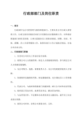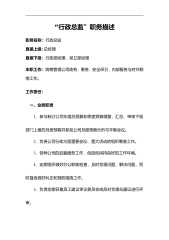 “行政总监”职务描述职务名称:行政总监直接上级:总经理直接下级:行政部经理、保卫部经理本职工作:统筹管理公司政务、事务、安全保卫、内部服务与对外联络工作。工作责任:一、业务职责1、参与制订公司年度总预算和季度预算调整,汇总、审核下级部门上报的月度预算并参加公司月度预算分析与平衡会议。2、负责公司行政方面重要会议、重大活动的组织筹备工作。3、领导公司的后勤服务工作,创造和保持良好的工作环境。4、定期组织做好办公职能检查,及时发现问题、解决问题,同时督促做好纠正和预防措施工作。5、负责定期召集员工建议审议委员会成员对合理化建议进行评审。6、接待公司重要来访客人,处理行政方面的重要函件。7、领导公司...