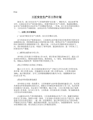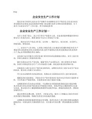 Print企业安全生产工作计划 落实企业主体责任,是安全生产法赋予企业保障安全生产的法定义务,是企业自身发展的内在要求,也是各级政府和部门依法履行监管主体职责的客观要求。以下是关于企业安全生产工作计划,供大家阅读参考! 企业安全生产工作计划一 安全工作重于泰山,是公司日常生产的重中之重。在追求质量和数量的同时应将安全工作放在首位。现将20XX年安全工作做如下计划: 一、我们安全生产的总方针是:安全第一、预防为主、综合治理、全员参与、控制风险、持续改进。 二、安全生产工作目标:人身伤亡事故为零;火灾事故为零;爆炸事故为零;生产事故为零;设备事故为零;污染事故为零;急性中毒事故为零;职业...