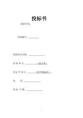 投标书(指导书)招标编号:投标项目名称:投标单位:(盖公章)法定代表人:(签字或盖章)电话:投标日期:11.1法定代表人身份证明姓名:性别:年龄:职务:系法定代表人人。特此证明。投标单位:(盖公章)日期:1.2投标人近三年施工业绩(文字说明)21.3对招标文件及合同条款的承诺和补充意见陕西省第一建筑工程公司项目经理部:根据你方招标工程编号为的工程招标文件及有关规定,经考察项目现场和研究上述招标文件、合同条款、图纸工程建设标准和工程量清单及其他有关文件后,我方对你方做出如下承诺:1、我方愿意以每平方米元的综合报价或基础以每平方米元、±0以上元的承包单价,承包上述招标范围内的工程项目施工。2、我方...