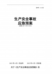 预案编号:XXXXXX-YA-001预案版本号:第一版XXXX有限公司生产安全事故应急预案(依据GB/T29639-2020)编制依据:《生产安全事故应急预案管理办法》(应急管理部令第2号)《生产安全事故应急条例》(国务院令第708号)《生产经营单位生产安全事故应急预案编制导则》(GB/T29639-2020)编制单位:****有限公司签发人:XXX颁布日期:2021年4月1日实施日期:2021年4月1日(封面页)应急预案编号:****2021应急预案版本号:2021第1版XXXX有限公司生产安全事故应急预案(模板)颁布日期:2021年4月1日实施日期:2021年4月1日xx集团有限公司(章)...