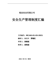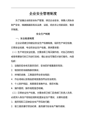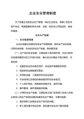 企业安全管理制度为了加强企业的安全生产管理,保证企业安全,保障人民生命财产安全,根据国家的有关法律、法规,结合本公司的实际,制定本制度。安全生产制度一、安全检查制度企业必须建立和健全安全生产检查制度。组织生产岗位检查、日常安全检查、专业性安全生产检查。具体要求是:(一)生产岗位安全检查。主要由职工每天操作前,对自己的岗位或者将要进行的工作进行自检,确认安全可靠后才进行操作。内容包括:1.设备的安全状态是否完好,安全防护装置是否有效;2.规定的安全措施是否落实;3.所用的设备、工具是否符合安全规定;4.作业场地以及物品的堆放是否符合安全规范;5.个人防护用品、用具是否准备齐全,是否可靠;6.操作...