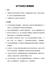 生产车间员工管理制度1、总则1.1、为确保生产秩序,保证各项生产正常运作,持续营造良好的工作环境,促进本公司的发展,结合本公司的实际情况特制订本制度。1.2、本制度适用于本公司各生产车间全体员工。2、员工管理2.1、工作时间内所有员工倡导普通话,、提倡文明礼貌,现场作业严禁使用侮辱性字眼,不讲脏话,在工作及管理活动中严禁有地方观念或省籍区分。2.2、全体员工须按要求佩戴厂牌(应正面向上佩戴于胸前),穿厂服。不得穿拖鞋进入车间2.3、每天正常上班时间为8小时,晚上如加班依生产需要通知。加班时间由生产副总经理安排或由车间申请,生产部经理审核生产副总经理批准。2.4、员工必须遵守上下班作息时间,按时...
