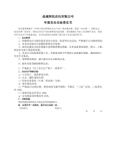 盐城利民农化有限公司年度安全目标责任书为全面贯彻执行《中华人民共和国安全生产法》等法律法规,坚持“安全第一,预防为主,综合治理”的方针,落实安全生产责任制和责任追究制,切实保障公司员工生命财产安全,实现全年安全生产无事故目标,公司车间主任与氯化工签订如下安全目标责任书。一、安全职责1、参加安全活动、学习安全技术知识,严格遵守各项规章制度。2、执行交接班制度,接班前必须认真检查本岗位的设备和安全设施及工、器具是否齐全完好。3、遵守纪律,精心操作,严格执行工艺操作规程、安全操作规程。记录清晰、真实、整洁,并保持作业场所清洁。4、按时巡回检查,准确分析、判断和处理生产过程中的异常情况。5、维护保养设...
