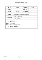 更多资料淘宝搜索店铺商道学院微信76650998物流仓库安全员岗位职责部门总务部岗位名称安全员任职人任职人签字直接主管总务主任直接主管签字工作描述负责公司消防、安全等日常事务管理工作工作协调关系内部仓库各环节外部相关客户任职条件1、男性,50岁以下。2、中专学历以上。3、具有5年以上相关工作经验。4、身体健康,无隐性疾病。发布日期Page1of2更多资料淘宝搜索店铺商道学院微信76650998工作范围1.检查落实各防火措施,定期组织消防培训和演习工作,确保用火安全;负责安全设施、防护器材、灭火器材的管理。2.深入现场监督检查,及时发现安全隐患,大胆管理,按章办事,不徇私情,坚决制止违章作业,对...