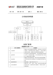 深圳市万科房地产有限公司SHENZHENVANKEREALESTATECO.,LTD.质量手册第11章页号:第1/7页版号:A修改:第0次公司组织架构图各部门职责总经理办公室部门职责部门主要职责目标要求1.计划管理根据公司经营战略和发展策略,组织制定公司经营计划体系,监督和推进各级计划的执行,反馈计划执行过程中的信息,确保公司经营管理目标的实现2.品质管理参与制定公司品质管理体系,并负责体系的日常运作与评审。发现品质问题,并负责督促相关部门从组织、流程等方面予以解决3.信息管理根据公司经营管理目标,制定长远信息化建设战略。从管理和技术两方面推进公司内360度信息传递与沟通。4.创新联盟组织推动...