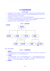 小公司规章管理制度第一章.总则1.本制度根据《中华人民共和国劳动法》等有关劳动政策,法规及**有限公司的各项规章制度而制定.2.本制度制定的目的是为了规范员工行为,激发员工的主动性,积极性和创造性,维护正常的工作秩序,提高工作绩效,促进本公司的经营发展.3.本制度适用于本公司全体员工,全体员工均应按本制度各项规定执行.4.员工应遵守本公司的各项规章制度,关心企业发展,热爱本职工作,讲究职业道德,不断的加强自身学习,钻研业务,提高业务技能,发扬团队精神,共同协作,完满的完成各项任务.5.此制度将作为新入职员工必须熟悉和掌握,并签名确认之。 第二章.公司组织架构公司架构图 说明:岗位职责见附件。第...
