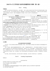 2018年6月大学英语六级考试真题答案与详解(第1套)PartIWriting审题思路:这是一篇六级考试中常见的议论文。此次话题——雇主与雇员之间的信任是日常生活中经常提及的话题,因此写起来应该并不难。考生应该将重点放在第二段阐述雇主与雇员彼此信任带来的益处上,如相互信任有助于提高员工的工作热情和工作效率;有利于营造愉悦的工作氛围;有益于公司和个人的发展及进步。高分范文:高分范文精彩点评TheImportanceofBuildingTrustBetweenEmployersandEmployees①Itisanundeniablefactthattrustcanlayasolidfoundat...