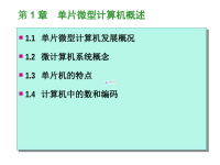 第1章单片微型计算机概述1.1单片微型计算机发展概况1.2微计算机系统概念1.3单片机的特点1.4计算机中的数和编码1.1单片微型计算机发展概况单片机体积小、功能强、功耗低、可靠性高和性价比高的特点,在过程控制、机电一体化产品、智能仪器、家用电器、计算机网络及通讯等方面得到广泛应用。单片机经历了一位、4位、8位、16位及32位的发展阶段,世界上一些著名的半导体器件厂家都开发了单片机如Intel、Motorola、Zilog、Philips等。单片机的品种日益增加,在众多的通用型单片机里,以Intel公司的MCS系列单片机最为著名。返回本章首页1.2微计算机系统概念图1-1微处理器...