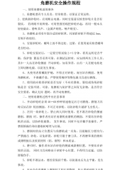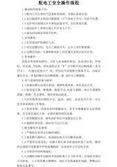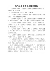 电气设备安装安全操作规程1、安装高压油开关、自动空气开关等有返回弹簧的开关设备时,应将开关置于断开位置。2、搬运配电柜时,应有专人指挥,步调一致。3、多台配电盘(箱)并列安装时,手指不得放在两盘(箱)的接合部位,不得触摸连接螺孔及螺丝。4、露天使用的电气设备,应有良好的防雨性能或有可靠的防雨设施。配电箱必须牢固、完整、严密。使用中的配电箱内禁止放置杂物。5、进行耐压试验装置的金属外壳须接地,被试设备或电缆两端,如不在同一地点,另一端应有人看守或加锁。对仪表、接线等检查无误,人员撤离后,方可升压。6、电气设备或材料,作非冲击性试验,升压或降压,均应缓慢进行。因故暂停或试压结束,应先切断电源,安全...