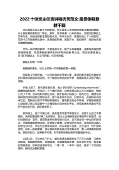 2022十佳班主任演讲稿优秀范文:是爱使我勤耕不辍 也许是受父亲从教工作的影响,也许是受上学时期老师敬业精神的熏陶,从小我就喜欢教师这一职业,那时,经常拿着一小块粉笔头,在破旧的黑板上写来写去,在破旧的教室里指指点点。师专毕业后,我真的当上了一名教师。在我十三年的教育生涯中,我用我的热情、我的汗水、我的艰辛、我的快乐谱写着爱的篇章。 作为一名优秀的教师,尤其是班主任,除了业务要精湛,还要有较高的思想道德素质、吃苦奉献的精神和科学有效的教育方法,而这些都是建立在"爱"的基础上,对工作的爱,对学生的爱。 爱是上好每一节课 我爱我的事业,所以上好每一节课是我的第一愿望。 刚参加工作的时候,...