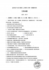 盐亭县中2023届高三上学期9月第一次模拟考试生物试题总分:90分一、选择题(1-30题,每题1分;31-40题,每题2分。共50分。)1.“清明时节雨纷纷,路上行人欲断魂。借问酒家何处有,牧童遥指杏花村。”徜徉古诗意境,思考科学问题。下列观点错误的是( )A.纷纷细雨能为杏树开花提供必需的水分B.杏树开花体现了植物生长发育的季节周期性C.花开花落与细胞生长和细胞凋亡相关联D.“杏花村酒”的酿制,酵母菌只进行无氧呼吸2.用白萝卜制作泡菜的过程中,采用适当方法可缩短腌制时间。方法中错误的是( )A.将白萝卜切成小块B.向容器中通入无菌空气C.添加已经腌制过的泡菜汁D.用沸水短时处理白萝卜块3...
